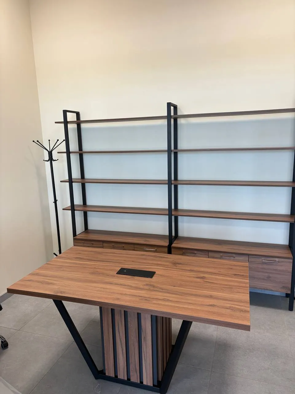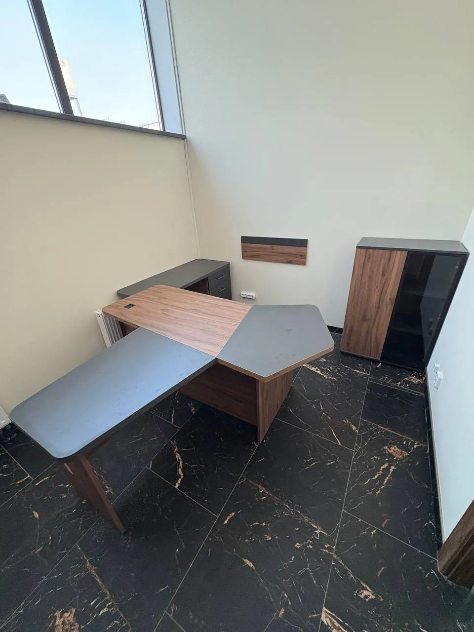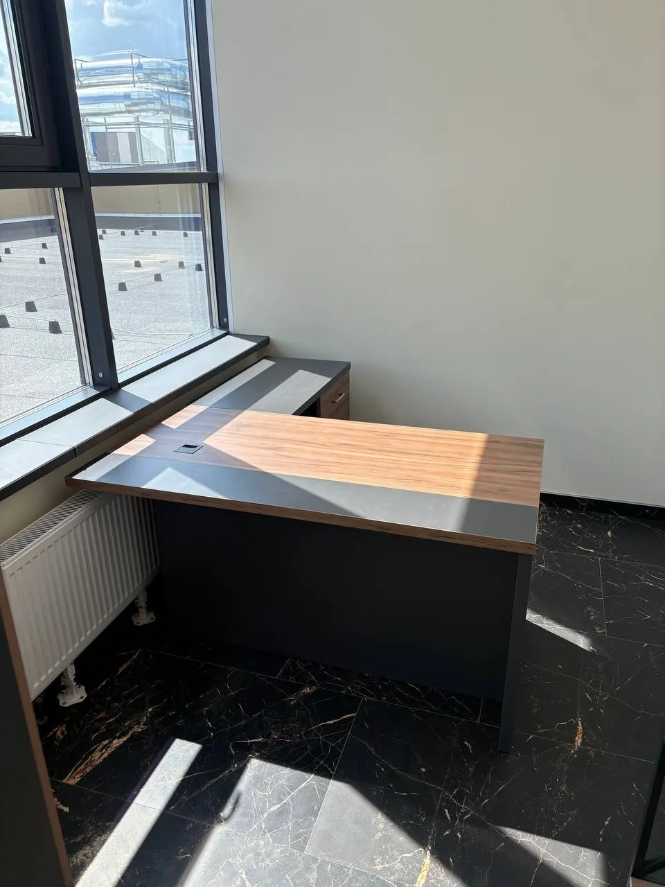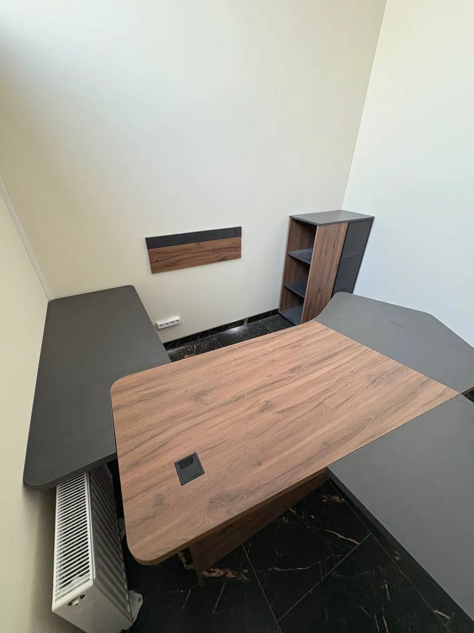 Наша компания изготовила полный комплект современной офисной мебели, демонстрирующий высокое качество исполнения и продуманный дизайн. Реализованные решения: Рабочие места руководителей: • Угловые столы с расширенной рабочей поверхностью из качественного ЛДСП под дерево; • Встроенные тумбы с выдвижными ящиками для организации рабочего пространства; • Элегантное сочетание древесных текстур с темными акцентами. Системы хранения: • Высокие шкафы-купе с комбинированными фасадами (дерево + антрацит); • Модульные стеллажи с открытыми полками для документооборота; • Настенные шкафы для рационального использования пространства. Диспетчерская: • Специализированная мебель для диспетчерских и операторских; • Интеграция с техническими системами и пультами управления; • Эргономичные рабочие поверхности для длительной работы. Все изделия изготовлены с учетом индивидуальных потребностей заказчика и особенностей помещений. Мебель органично вписывается в современный офисный интерьер, обеспечивая комфортную и продуктивную рабочую среду.
