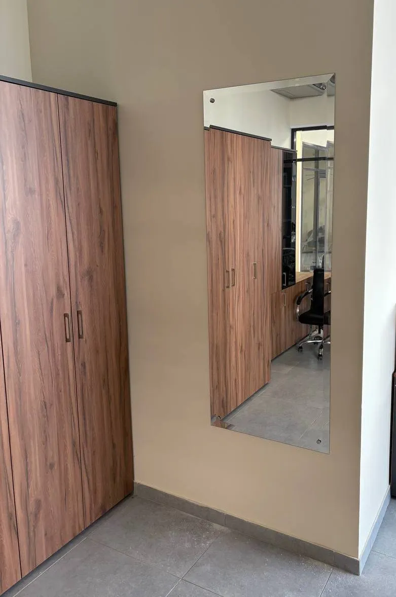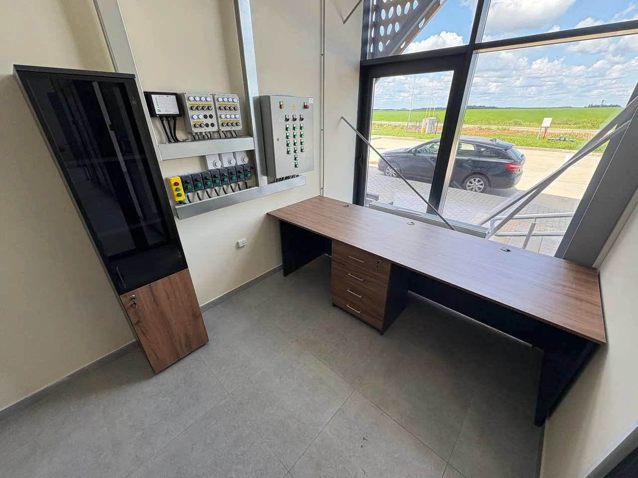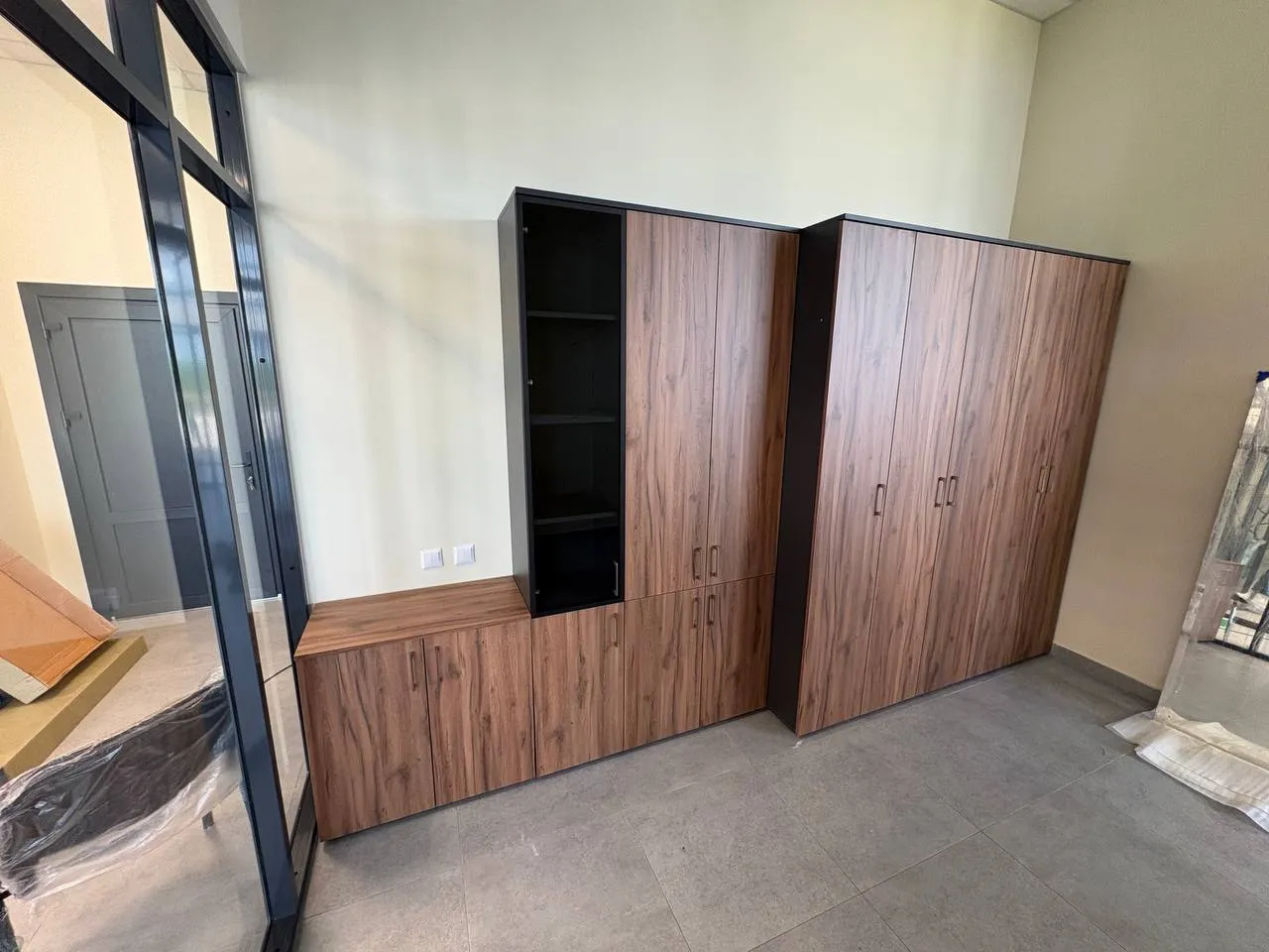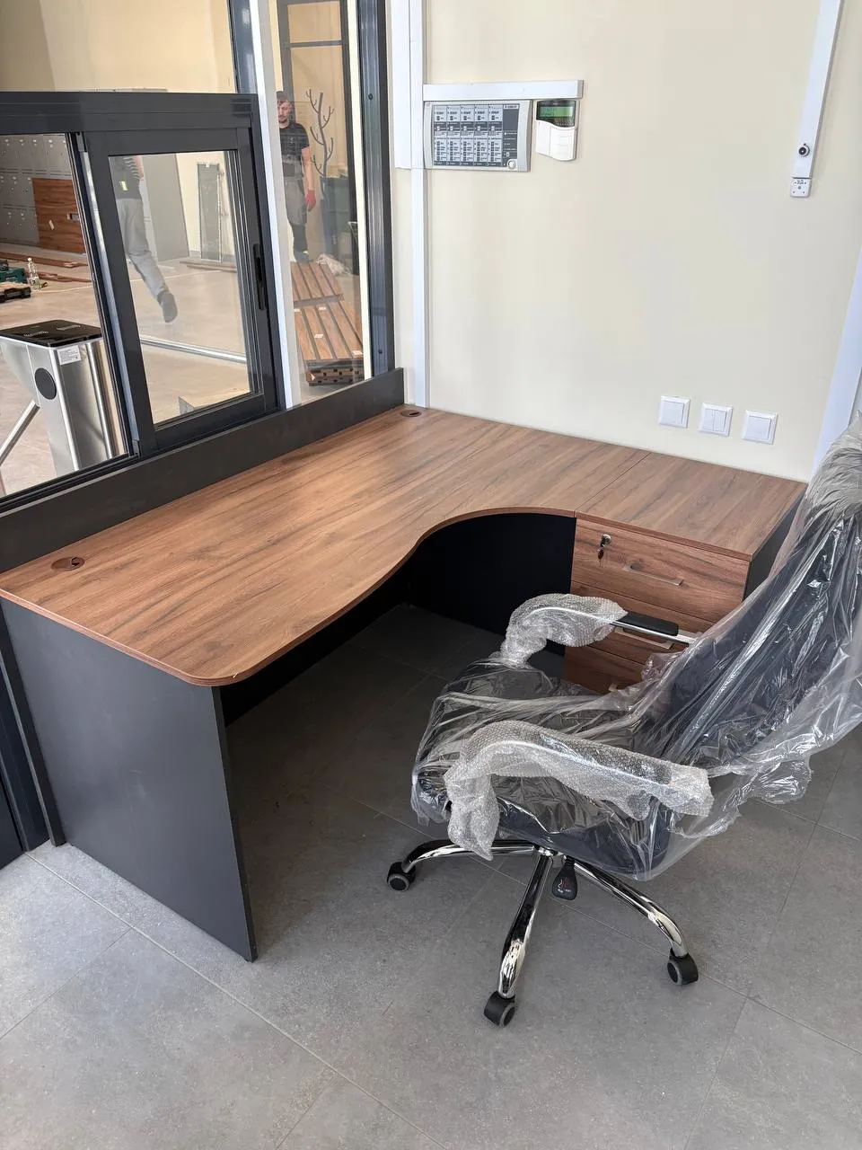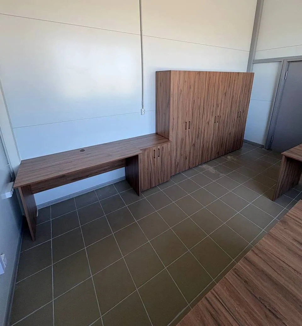 Наша компания изготовила полный комплект современной офисной мебели, демонстрирующий высокое качество исполнения и продуманный дизайн. Реализованные решения: Рабочие места руководителей: • Угловые столы с расширенной рабочей поверхностью из качественного ЛДСП под дерево; • Встроенные тумбы с выдвижными ящиками для организации рабочего пространства; • Элегантное сочетание древесных текстур с темными акцентами. Системы хранения: • Высокие шкафы-купе с комбинированными фасадами (дерево + антрацит); • Модульные стеллажи с открытыми полками для документооборота; • Настенные шкафы для рационального использования пространства. Диспетчерская: • Специализированная мебель для диспетчерских и операторских; • Интеграция с техническими системами и пультами управления; • Эргономичные рабочие поверхности для длительной работы. Все изделия изготовлены с учетом индивидуальных потребностей заказчика и особенностей помещений. Мебель органично вписывается в современный офисный интерьер, обеспечивая комфортную и продуктивную рабочую среду.