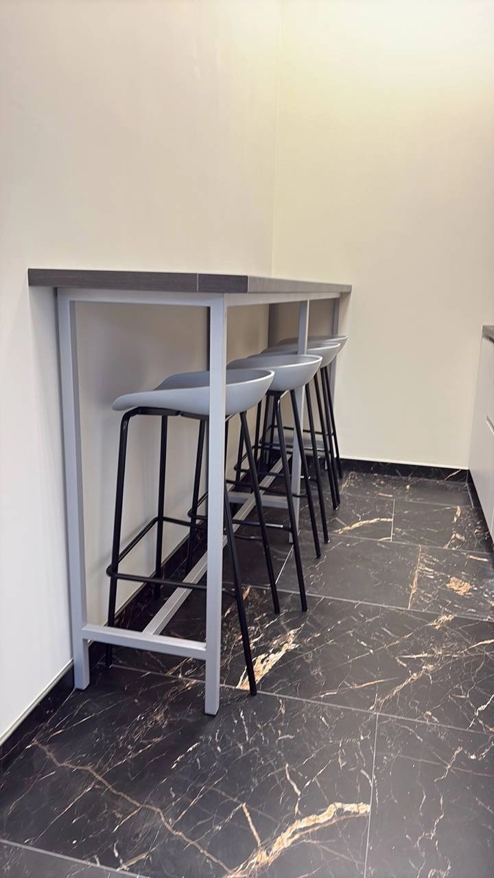 Представляем изготовленную на заказ кухонную мебель, которая идеально сочетает в себе современный дизайн и практичность. Наша команда создала уникальное решение, объединяющее несколько функциональных зон в едином стилевом решении. Гармоничное сочетание белого и репродукции натурального дерева создает ощущение легкости и тепла. Фурнитура скрытого монтажа для максимальной эстетики. Высокий стол с интегрированными полками для хранения. Эргономичные барные стулья с металлическими ножками. Идеальное решение для быстрых завтраков и неформального общения. Эта кухня станет центром офиса, где функциональность встречается с безупречным стилем. Каждая деталь продумана для максимального комфорта и эстетического наслаждения.
