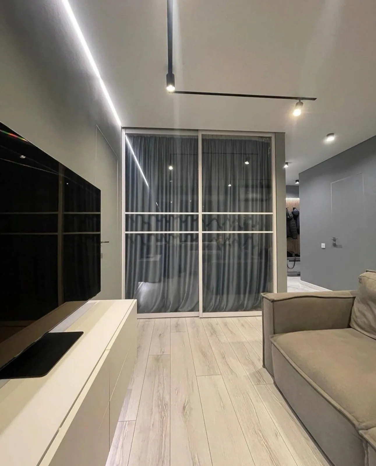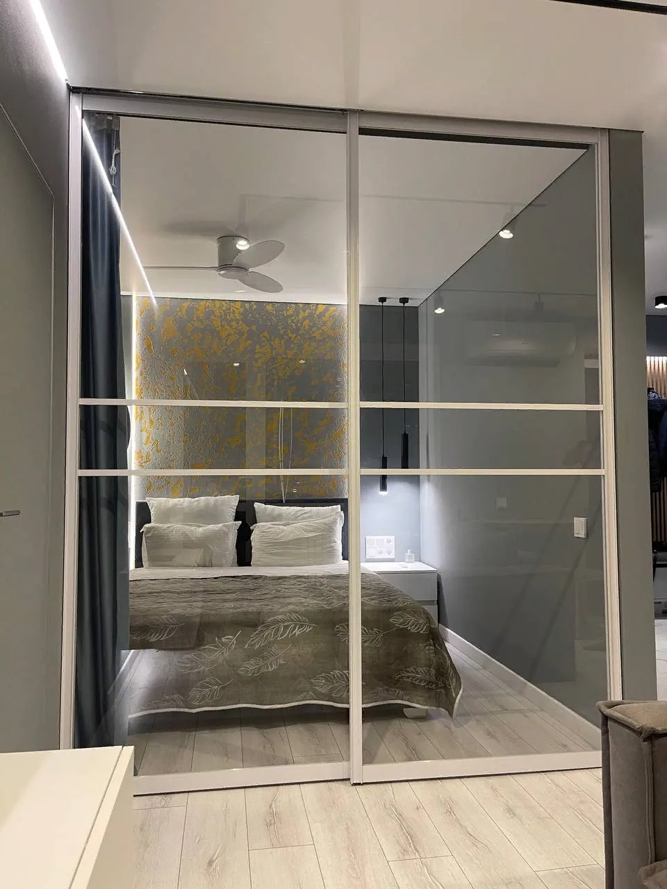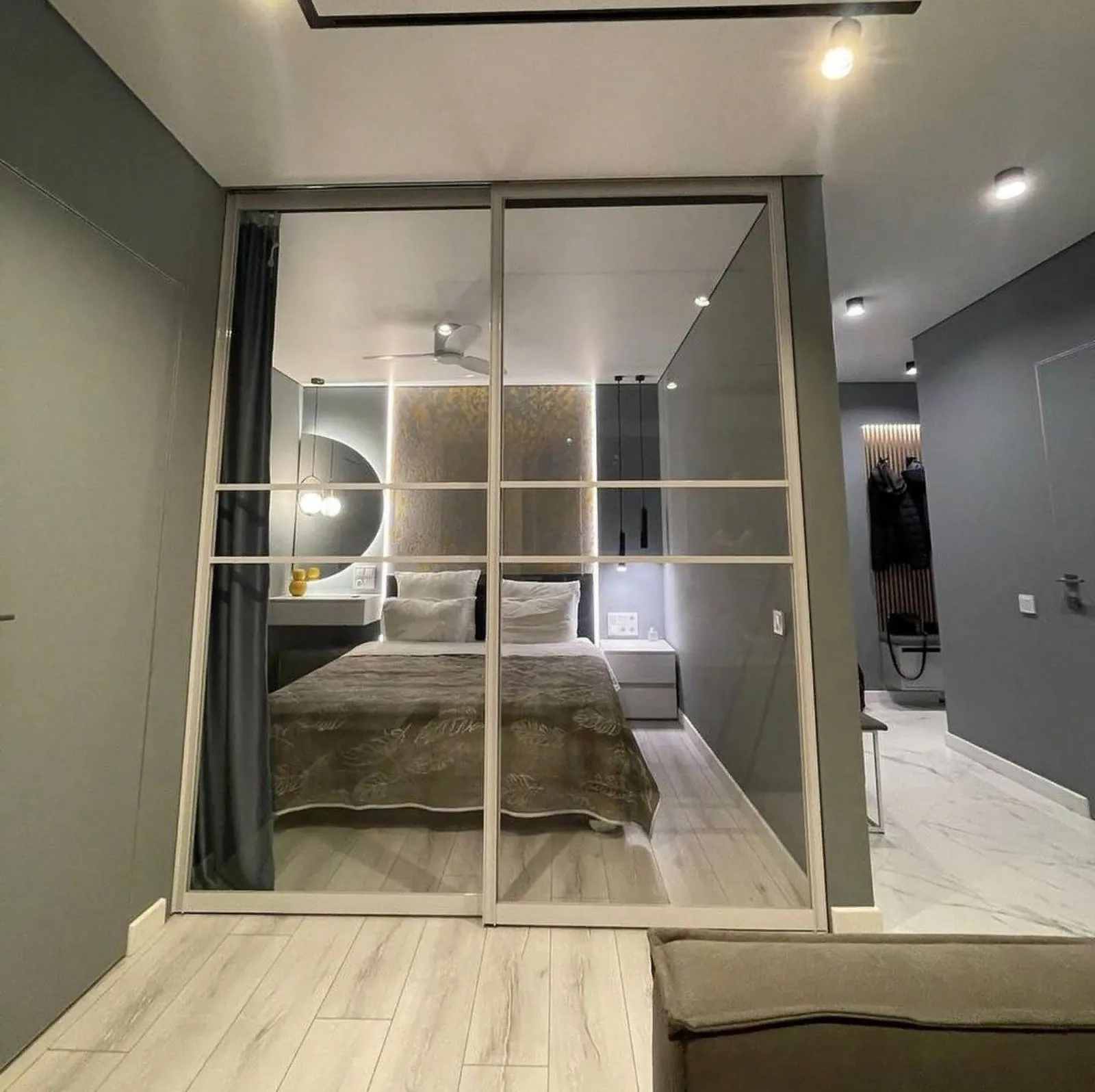 Всё быстрее набирает популярность зонирование пространства с помощью систем межкомнатных перегородок. Система не нуждается в напольных направляющих,проём полностью свободен. Сама конструкция состоит из нескольких элементов – верхний направляющий профиль,декоративная накладка,ролики,система стопорв Дизайн профиля-лаконичен и изящен,его форма служит удобной ручкой,позволяющей свободно перемещать створки. Использование прозрачного стекла в комплекте с профилем в цвете серебро,придаёт лёгкость конструкции и делает её ненавязчивой с эстетической точки зрения.