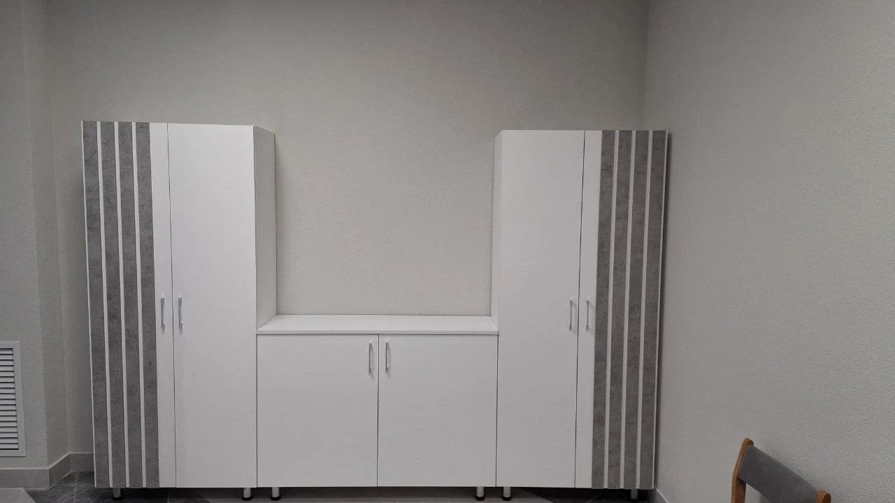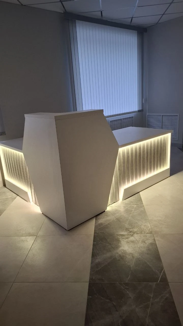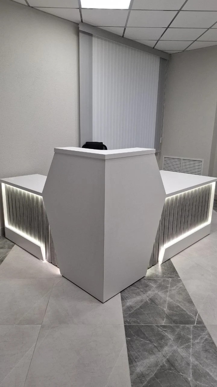 Рады представить нашу новую мебель для офисного пространства! Стойка ресепшн – белая, элегантная, с вертикальными серыми рейками и стильной подсветкой. Она не только привлекает внимание, но и создаёт уютную атмосферу для посетителей. Шкафы и тумба выполнены в той же изысканной стилистике, что идеально дополняет общий дизайн. Функциональность и стиль – это про нас! Эта мебель не только удобна, но и станет ярким акцентом вашего интерьера.