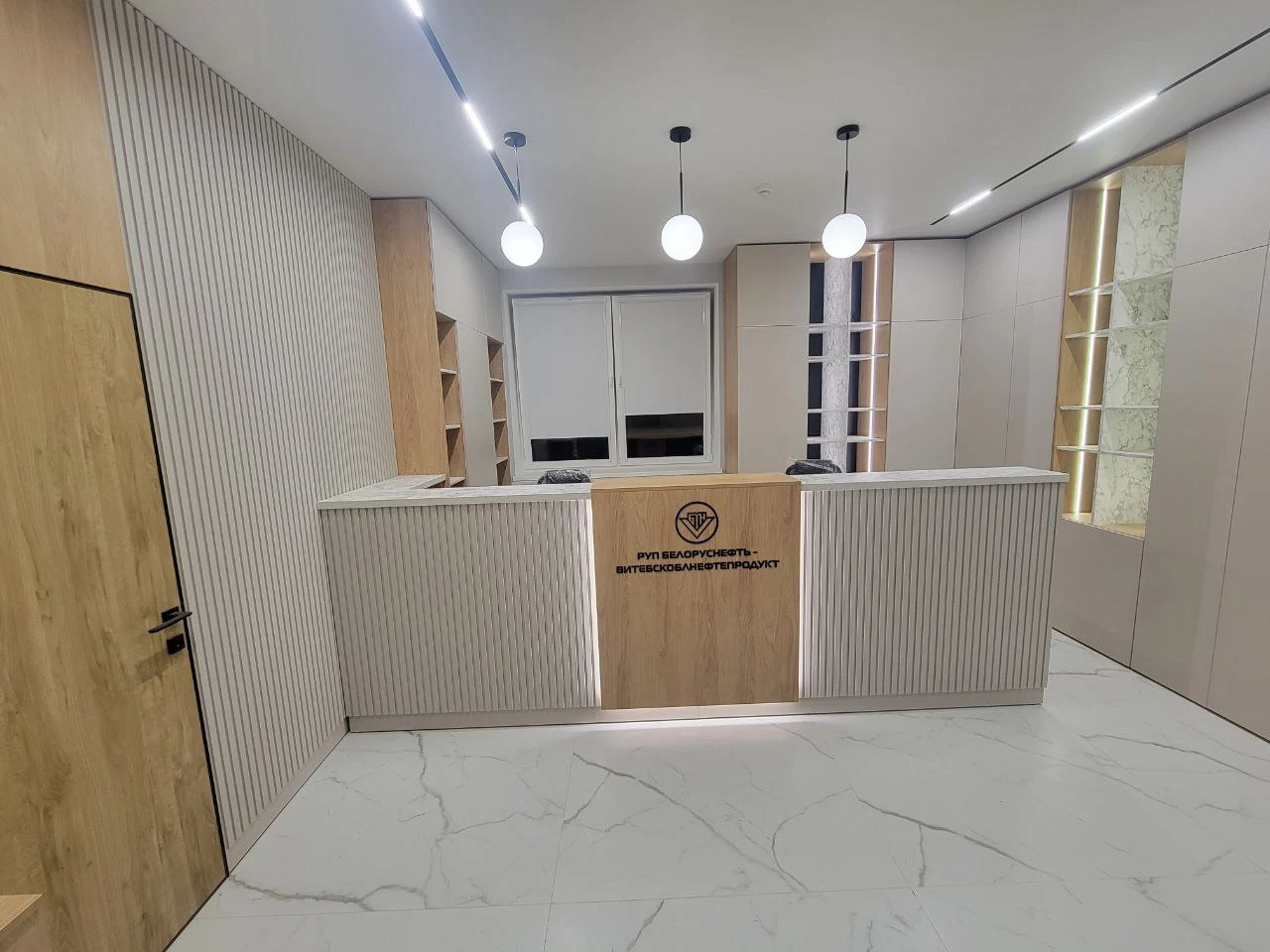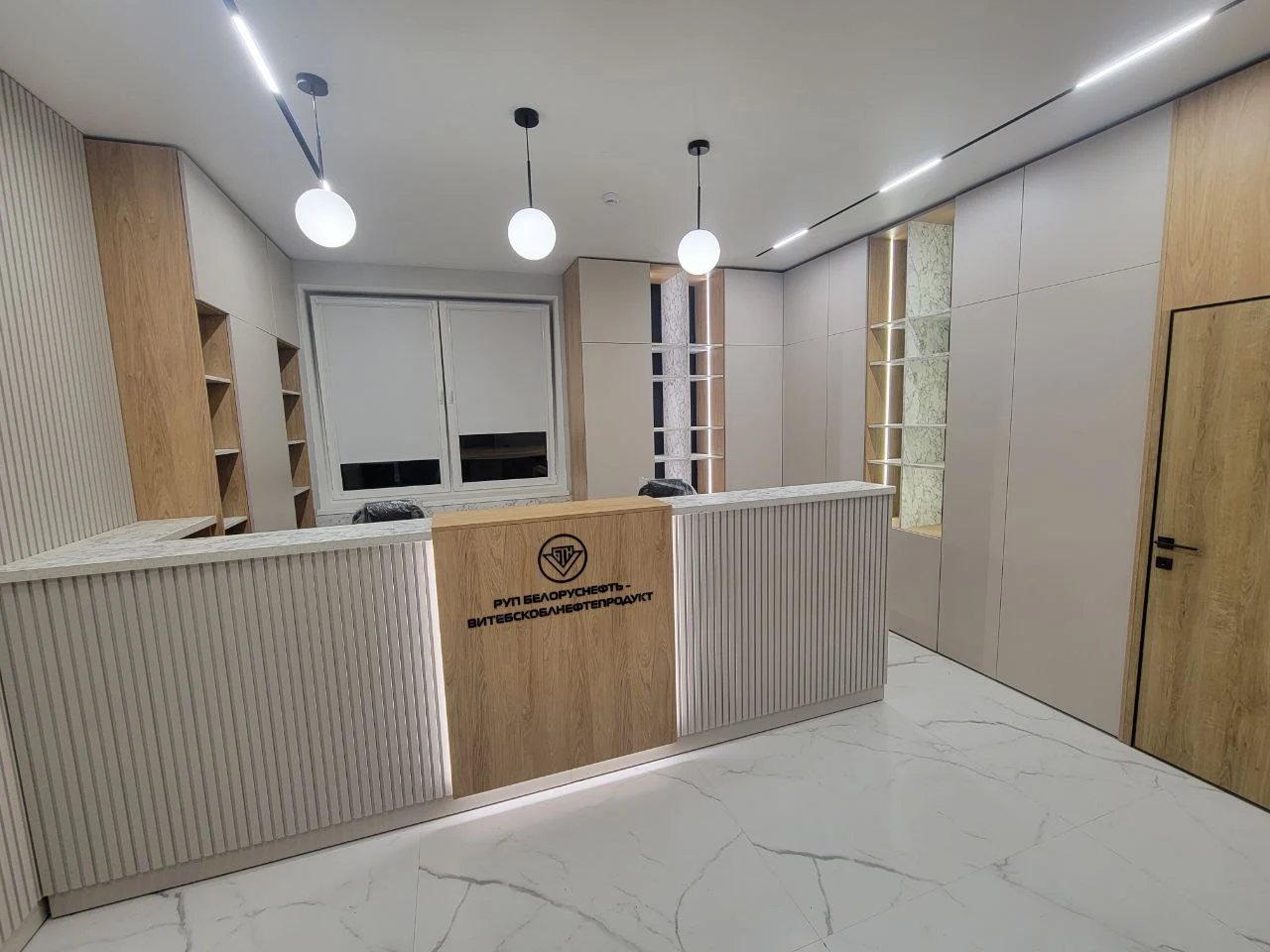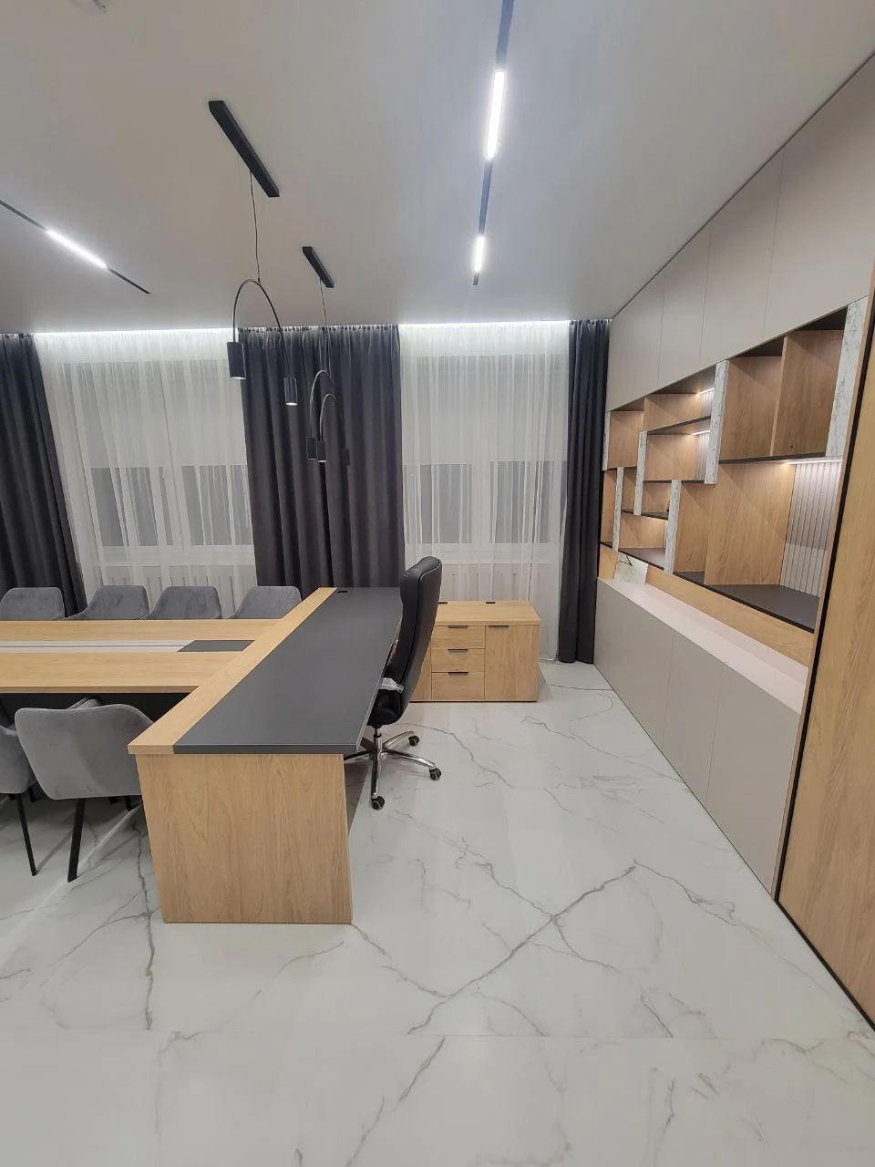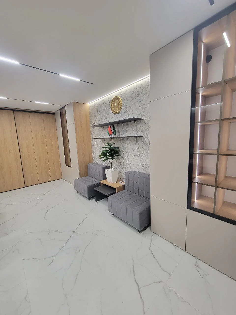 Современный кабинет руководителя. Финальная стадия проекта позади, демонстрируем вам комплексное решение для офисного пространства в современном стиле с использованием натуральных текстур и продуманной функциональностью. Дизайн выполнен в сдержанной цветовой гамме с преобладанием репродукции древесины, белых и серых тонов. Основная идея - создание престижного и функционального офисного пространства, которое сочетает в себе представительность и практичность. Материалы и отделка: - Фасады выполнены из ЛДСП с выраженной текстурой древесины; - Корпусная часть в белом цвете создает контраст и визуально облегчает конструкции; - Столешницы с декоративными вставками темного цвета; - Рифленые панели на стенах добавляют текстурности интерьеру. Переговорная комната: - Большой конференц-стол на 8-10 человек с интегрированными коммуникациями; - Встроенная мебельная стенка с открытыми полками для документов и декора; - Скрытые системы хранения в боковых панелях. Зона ресепшн: - Представительная стойка с фирменной символикой; - Интегрированное освещение в нижней части стойки; - Скрытые системы для размещения оргтехники. Кабинет руководителя: - Встроенная мебельная стенка с ТВ-зоной; - Комбинированные системы хранения (открытые и закрытые секции); - Рабочая зона интегрирована в общую композицию. Приемная/зона ожидания: - Встроенные шкафы во всю высоту помещения; - Декоративная стена с государственной символикой и подсветкой; - Модульная мягкая мебель для посетителей. Многоуровневая система освещения включает линейные светильники в потолке, встроенную подсветку мебели и декоративные элементы, создающие комфортную рабочую атмосферу. В результате реализован полнофункциональный офисный комплекс, отвечающий всем требованиям современного делового пространства - от представительности до эргономики и практичности использования.