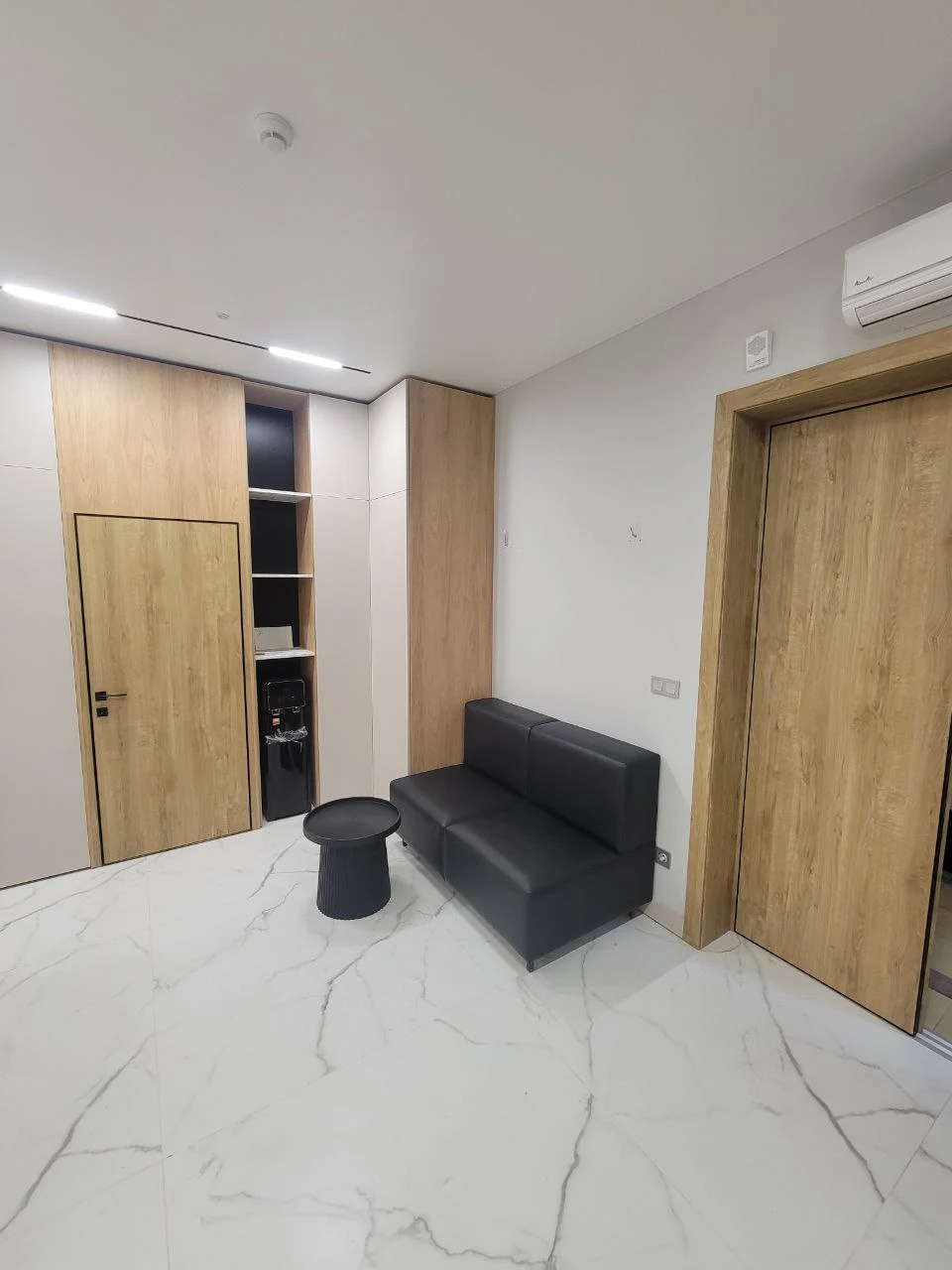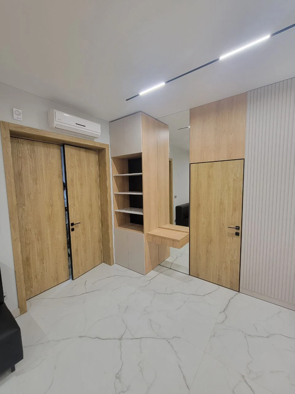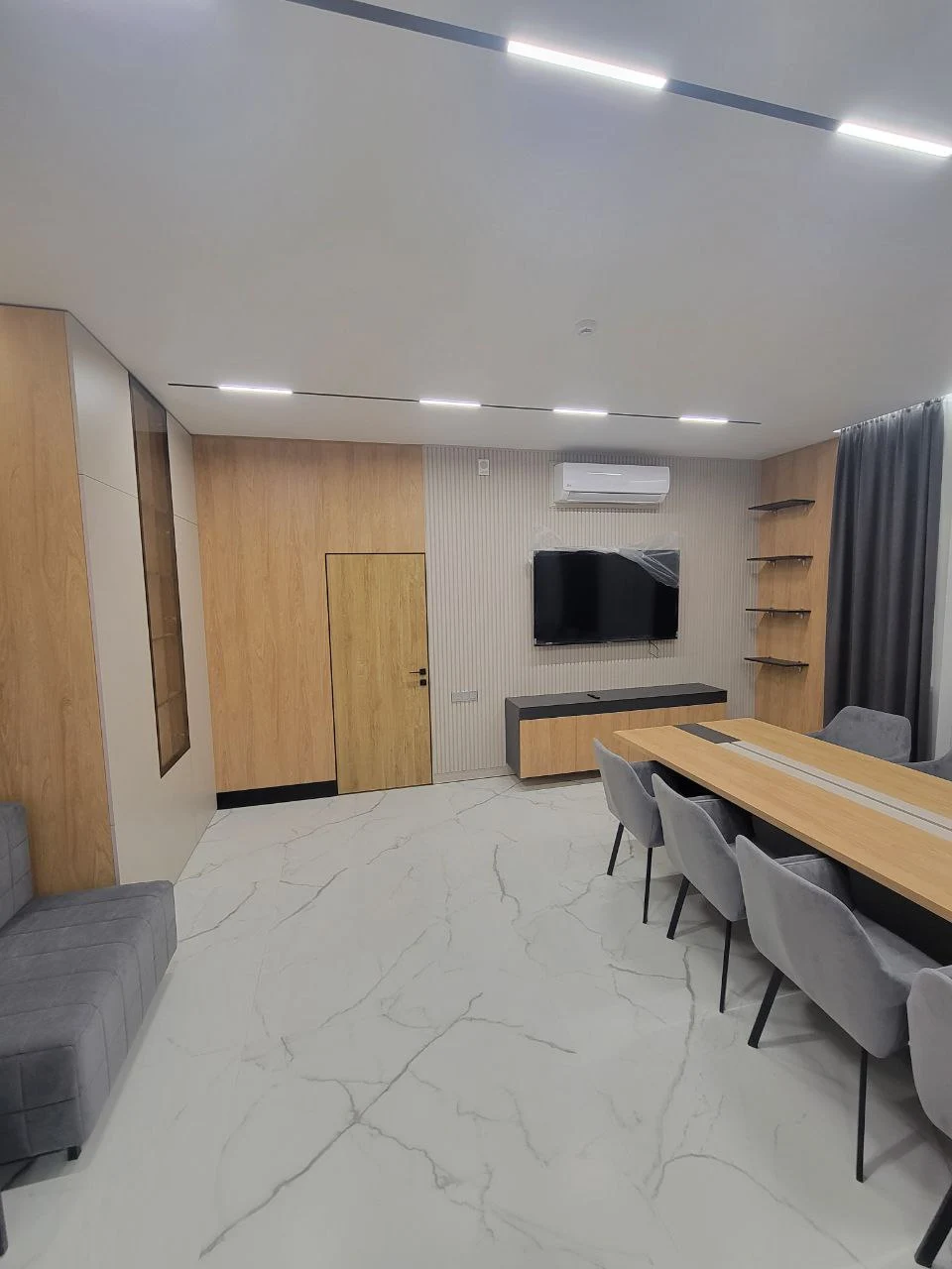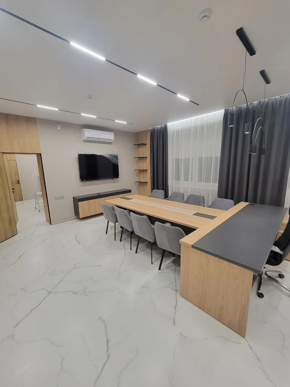Современный кабинет руководителя. Финальная стадия проекта позади, демонстрируем вам комплексное решение для офисного пространства в современном стиле с использованием натуральных текстур и продуманной функциональностью. Дизайн выполнен в сдержанной цветовой гамме с преобладанием репродукции древесины, белых и серых тонов. Основная идея - создание престижного и функционального офисного пространства, которое сочетает в себе представительность и практичность. Материалы и отделка: - Фасады выполнены из ЛДСП с выраженной текстурой древесины; - Корпусная часть в белом цвете создает контраст и визуально облегчает конструкции; - Столешницы с декоративными вставками темного цвета; - Рифленые панели на стенах добавляют текстурности интерьеру. Переговорная комната: - Большой конференц-стол на 8-10 человек с интегрированными коммуникациями; - Встроенная мебельная стенка с открытыми полками для документов и декора; - Скрытые системы хранения в боковых панелях. Зона ресепшн: - Представительная стойка с фирменной символикой; - Интегрированное освещение в нижней части стойки; - Скрытые системы для размещения оргтехники. Кабинет руководителя: - Встроенная мебельная стенка с ТВ-зоной; - Комбинированные системы хранения (открытые и закрытые секции); - Рабочая зона интегрирована в общую композицию. Приемная/зона ожидания: - Встроенные шкафы во всю высоту помещения; - Декоративная стена с государственной символикой и подсветкой; - Модульная мягкая мебель для посетителей. Многоуровневая система освещения включает линейные светильники в потолке, встроенную подсветку мебели и декоративные элементы, создающие комфортную рабочую атмосферу. В результате реализован полнофункциональный офисный комплекс, отвечающий всем требованиям современного делового пространства - от представительности до эргономики и практичности использования.