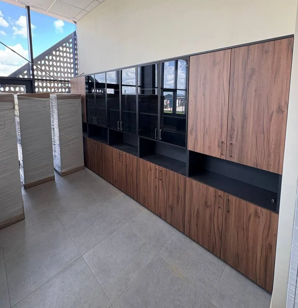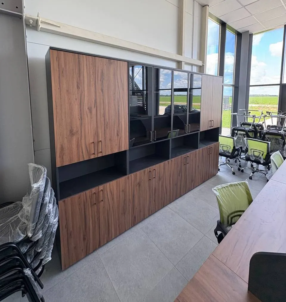 Представляем эксклюзивный комплект офисной мебели, созданный с учетом всех потребностей современного бизнеса. Эргономичные рабочие места с повышенным комфортом: рабочие столы с индивидуальными кабинками;просторные столешницы из высококачественного ламината с текстурой натурального дерева;встроенные тумбы с множеством выдвижных ящиков для организации документооборота;стильные черные перегородки, обеспечивающие приватность и концентрацию;кабель-менеджмент для аккуратной организации проводов;модульная система хранения. Максимальная функциональность в каждом сантиметре- комбинированные шкафы с открытыми и закрытыми секциями, сочетание текстуры дерева и элегантного черного стекла, регулируемые полки для хранения документов любого формата, витринные секции для презентации наград и важных материалов.