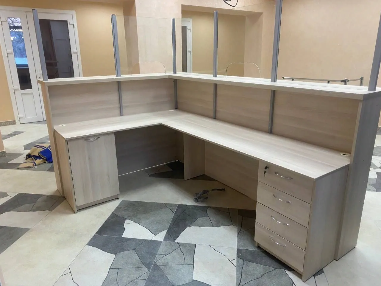 Приёмные зоны-это лицо компании и первое,что встречает клиента на входе.Ресепшн создавался для основных обязанностей администратора-комфортная работа за компьютером и информирование посетителей. Мебель для зоны ресепшн должна быть: эргономичной-оптимальной по размерам и форме, функциональной-оснащённой всевозможными системами для хранения документов, кабель-каналами для электропроводки и др., а также – что немаловажно!достаточно уютной и респектабельной. Ведь именно здесь Ваши потенциальные клиенты и партнёры будут получать первое представление о компании. Что было создано: - стойка-ресепшн с защитным экраном из стекла и встроенным столом для работы за компьютером.Фасад стойки выполнен в виде объёмных 3D элементов.Также добавлены две тумбы для хранения документов .
