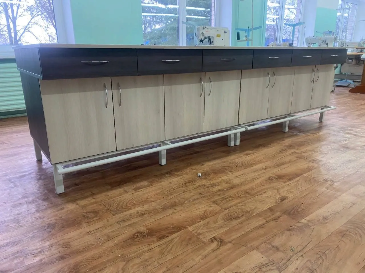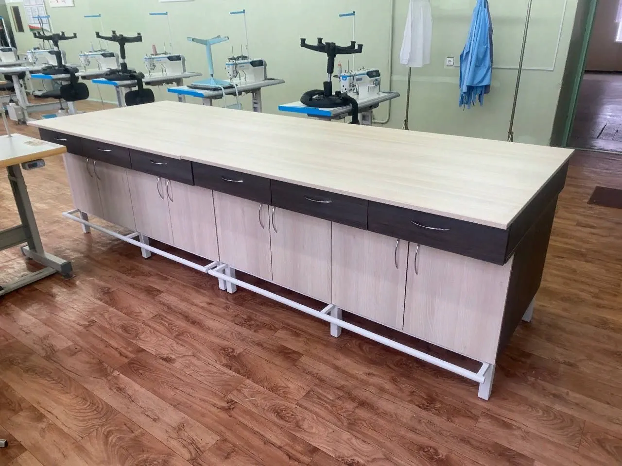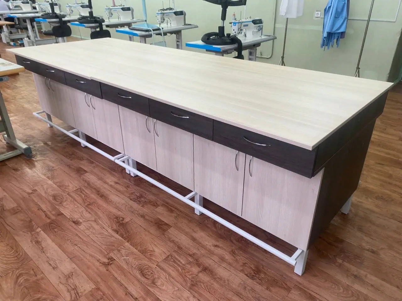 Важный показатель качества стола для швейного производства — его функциональность. В целях экономии времени необходимо, чтобы инструменты, фурнитура находились у швеи под рукой. Для хранения рулонов тканей, ножниц, мелких деталей и пр. рабочие столы оснащены большим количеством выдвижных ящиков и полочек,мастеру не придется тратить время на поиски предметов, а все рабочие процессы будут проходить легче и быстрее. Опоры стола выполнены из металла ,за счёт своей прочности и жесткости они прослужат долго и обеспечат отличную устойчивость стола во время работы.